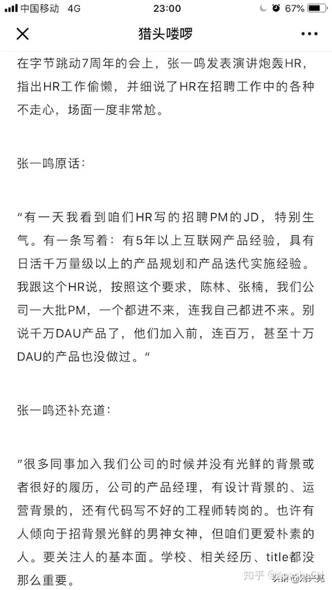 今日头条张一鸣炮轰公司HR: 按你们写的JD招聘,我自己都进不来公司