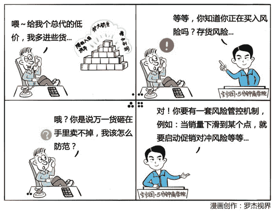 总代生意,本质是买卖风险,要在第一天,就建立一个风险管控机制。比如说,全周期库存管理,一旦销量下滑到什么程度的时候,就启动大规模的促销来对冲风险,降到另外一个什么程度的时候,就启动和合作伙伴之间的交叉销售,再降到什么时候,就把这批货作为礼品搭送给其他的商品。这个所谓全周期的库存管理,其实就是一套风险管控机制。没有金刚钻,就不揽瓷器活,没有这套全周期的库存管理机制之前,千万不要随便去玩用库存搏差价的风险买卖。