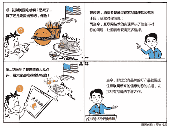 互联网赋予了你一个可以挑战大品牌的机会,你只需要选择一个有用户评价的体系,比如大众点评,比如支付宝,如果你的商品真的很好的话,一个没有品牌的好产品,将有可能迅速战胜一个有品牌的平庸之作。