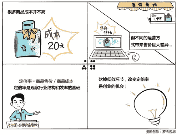 买国际品牌登山鞋,专卖店打折后2182元,京东价1188元,线上比线下便宜一半左右。因为线下的成本结构,导致5~10倍的定倍率是很合理的,而线上的成本结构,同样导致3倍是一个合理的定倍率。运营方式不同,带来运营效率不同,就产生了定倍率的巨大差异。