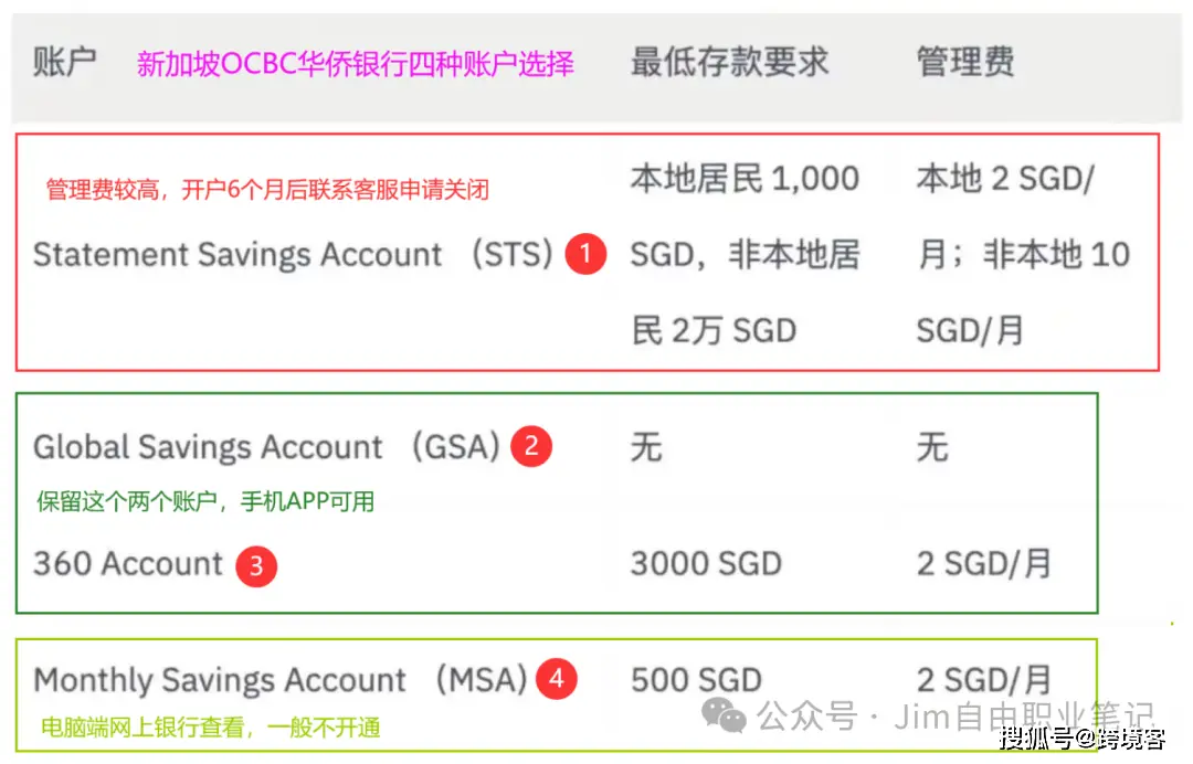 | Monthly Savings Account | MSA | 新币 | 500 SGD,否则每月管理费 2 SGD |