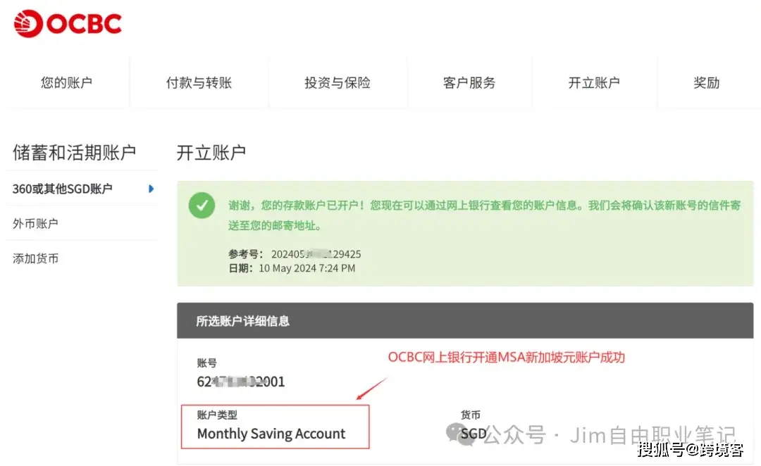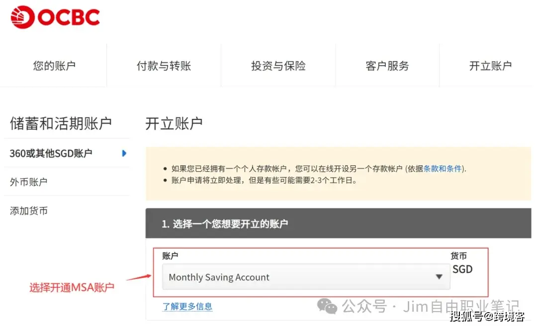 依次点击:导航栏——>开立账户——>360或其他SGD账户。