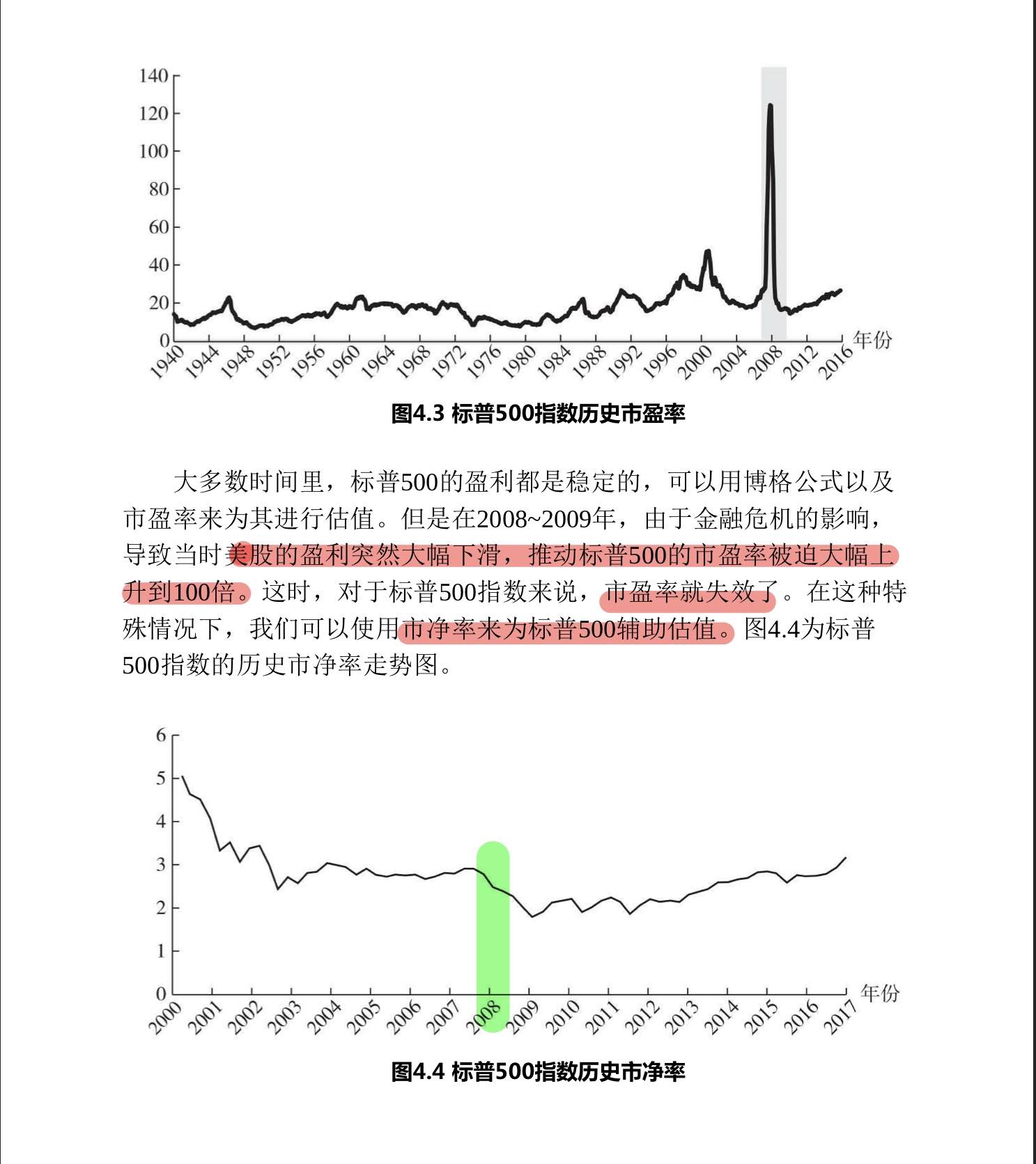 我们观察一下2000~2017年标普500的市净率走势,就会发现,实际上在金融危机的时候,美股已经到了估值的底部,并不是高估的。这就 是用市净率辅助估值的意义了。